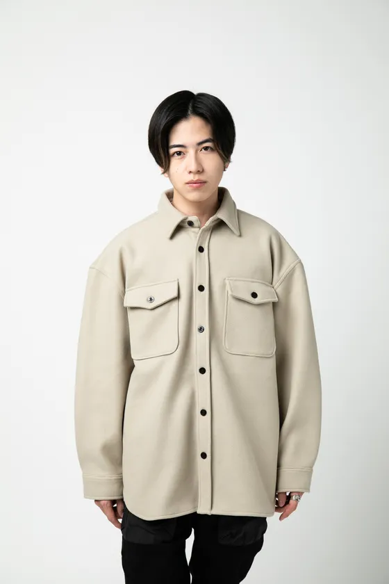 無地のクロのワイドテーパードパンツにはメリハリを付けてあったか素材のポケットシャツで。
