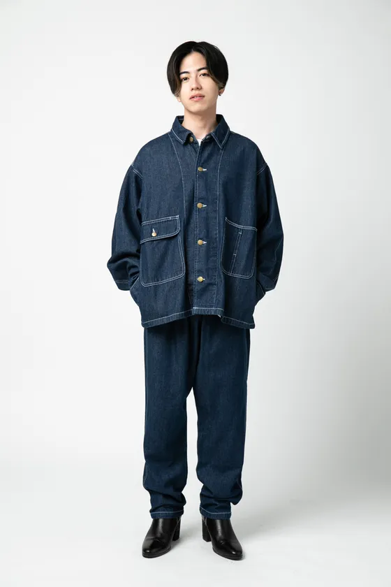 ダサくならないデニムオンデニム。ビッグサイズブルゾンに同系色のワイドイージー シェフパンツで。
