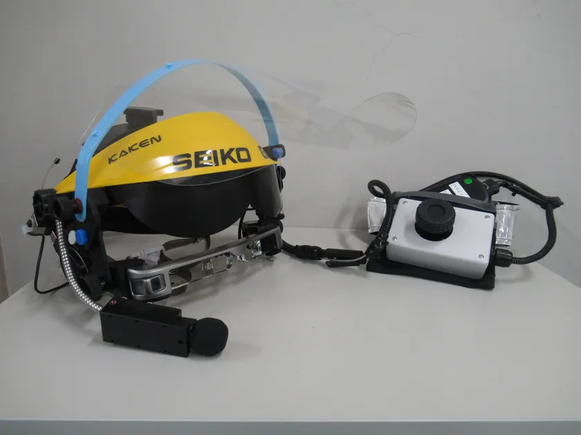 廃炉は安全・着実かつ速やかに進めることが必要です。このため、市販のものを改良。QRコードを読み取れるカメラが付いているセイコーエプソン社製のスマートグラスに、映像送信機能、ヘッドホン、マイク、フェイスシールドを追加し、グラスを上下に動かすための装置も付けました。