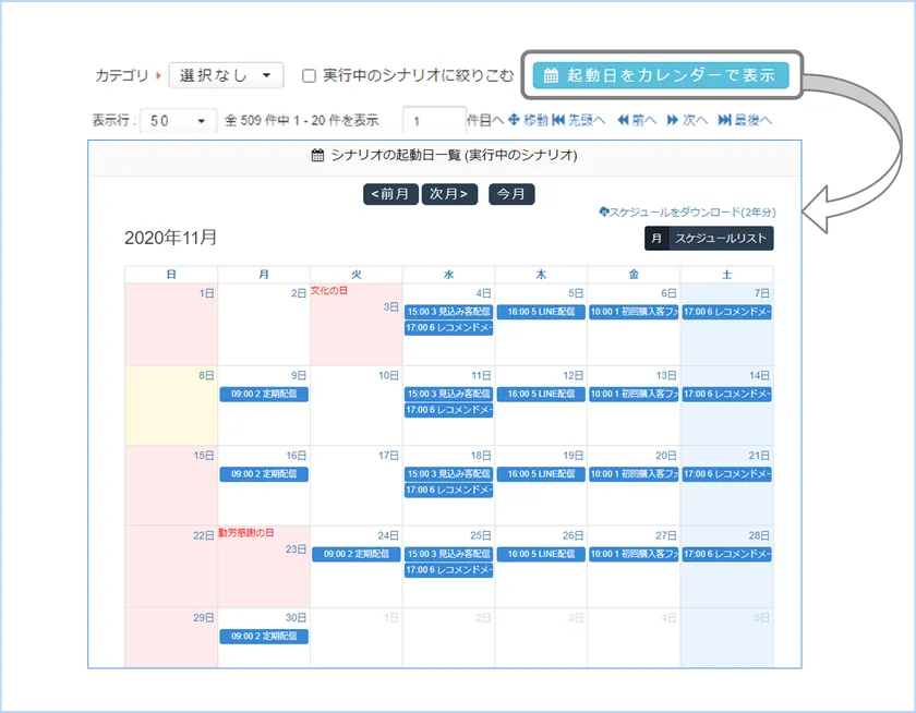 さらに、配信予定のシナリオ一覧をカレンダー形式で確認できるので、一瞥で全体の配信スケジュールを把握できるようになりました。事前に2年先までの特定日を配信日として登録できるので、実行中のシナリオ一覧がカレンダー上で2年先まで見られるほか、スケジュールリストで日別の起動シナリオが確認できます。またダウンロードした年間スケジュールでシナリオを容易に確認できます。