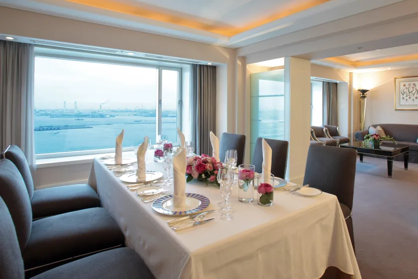 ダイニングサロンは、格調高い調度品を設えたダイニングルームとリビングルームを併せ持つ、贅沢なプライベートスペース。ベイブリッジや横浜港を望むベイビューと、大観覧車などを望むシティビューと、いずれのお部屋からもベイフロントならではの絶景をお楽しみいただけます。
