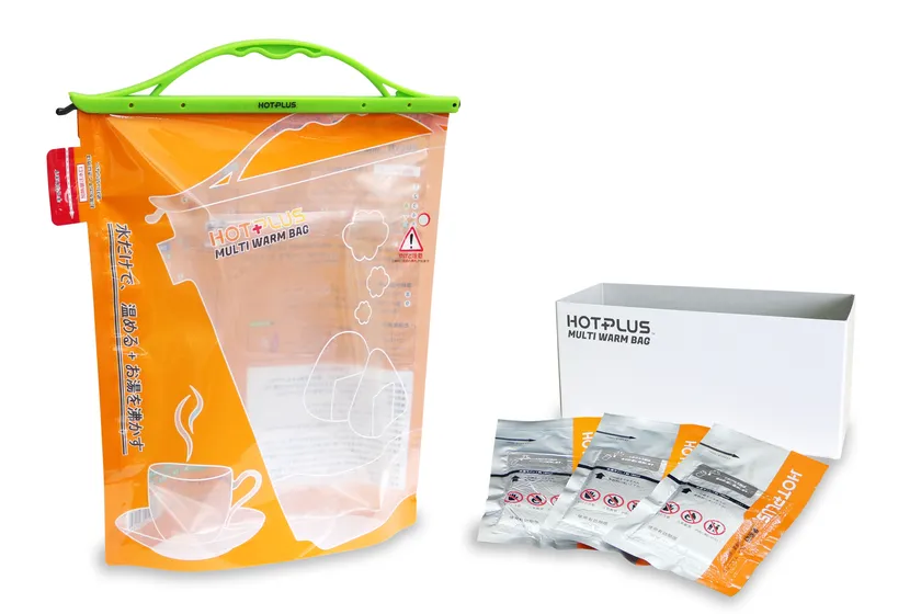 「ホットプラス マルチウォームバッグ」は、発熱剤と水、食品を袋の中に入れるだけで手軽に温めができる上、使用する袋は新開発の特殊な2層構造を採用しており、おにぎりや卵など幅広い食材が温められるだけでなく、袋内でお湯を沸かす事もできます。