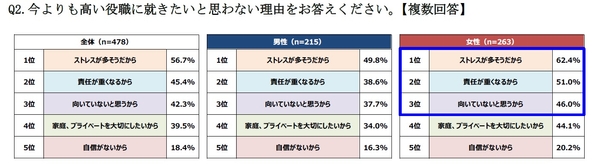 高い役職に就きたいと思わないと回答した478名にその理由をお聞きしました。最も多い回答は「ストレスが多そうだから」56.7%。次いで「責任が重くなるから」45.4%、「向いていないと思うから」42.3%と続く結果となりました。性別で比較をすると、女性の方が各項目回答した方が多い結果となっていますが、順位には変動はありませんでした。