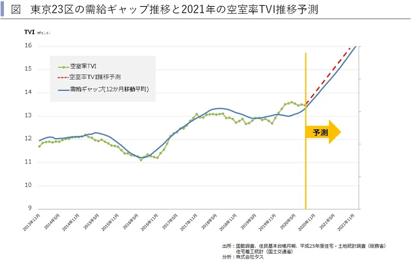 ・世帯数の増加幅がコロナ前の状態に戻らない限り、2021年の東京23区の需給ギャップは、拡大傾向で推移すると考えられます。これに伴い東京23区の空室率TVIも2021年は悪化基調で推移すると考えられます。