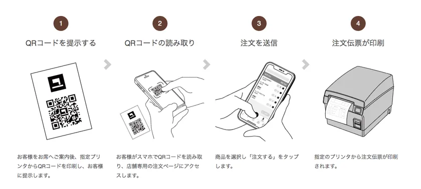 来店客が専用のQRコードを読み取り、店舗スタッフを経由することなく、自身のスマホから直接注文することができる対人非接触型のオーダリングシステムです。複数人でご来店の場合は、各々のスマホから同時に注文をすることも可能です。