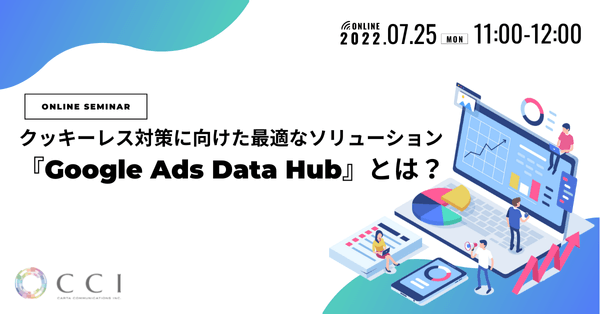 株式会社CARTA HOLDINGSのグループ会社である株式会社CARTA COMMUNICATIONS(本社:東京都中央区、代表取締役社長:目黒 拓、以下CCI)は、無料オンラインセミナー「クッキーレス対策に向けた最適なソリューション『Google Ads Data Hub(ADH)』とは?」を2022年7月25日(月)11:00より開催いたします。