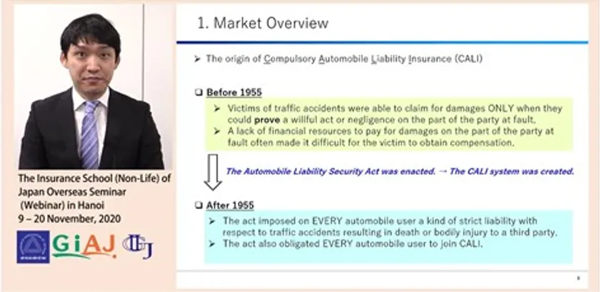 一般社団法人 日本損害保険協会(会長:広瀬 伸一)は、公益財団法人 損害保険事業総合研究所と共催で、ISJ(日本国際保険学校:Insurance School (Non-Life) of Japan)海外セミナーを11月9日から20日までベトナムを対象として開催し、日本の損害保険業界のノウハウを提供しました。セミナーは、新型コロナウイルス感染症への対応のため、オンラインで開催され、ベトナムの損保会社や保険監督官庁、政府機関等から165名が参加しました。講師は、日本の損保会社、金融庁、損保協会、損保総研の職員が務めました。
