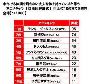 また、冬でも体調を崩さない丈夫な体を持っていると思う芸能人・アニメキャラを聞いたところ、芸能人では1位「武井壮さん」、2位「なかやまきんに君」、3位「松岡修造さん」、アニメキャラでは1位「モンキー・D・ルフィ(ONE PIECE)」、2位「孫悟空(ドラゴンボール)」、3位「竈門炭治郎(鬼滅の刃)」となりました。