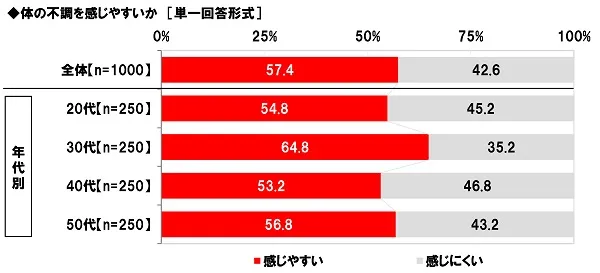 次に、体の不調を感じやすいか聞いたところ、「感じやすい」は57.4%、「感じにくい」は42.6%となりました。
