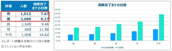 成績ごとの視聴完了までの平均日数から分析したところ、成績が優秀なほど視聴完了までの日数が短いことがわかりました。