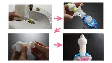 しかし、切削加工ではコストや加工性の問題から「丸く削る」ことしかできず、部品の見た目から新しい洗剤へ付け替える際に、部品を詰め替えパックに取り付けたまま捨ててしまったというご意見を多くいただくようになり、リブを付けることで部品本体を目立つように工夫しました。