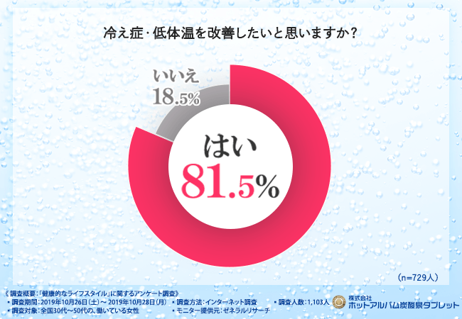 そこで、「冷え症・低体温を改善したいと思いますか?」という質問をしたところ、8割以上の方が『はい』(81.5%)と回答しました。 「冷え症・低体温」に対して多くの女性が悩んでいます。