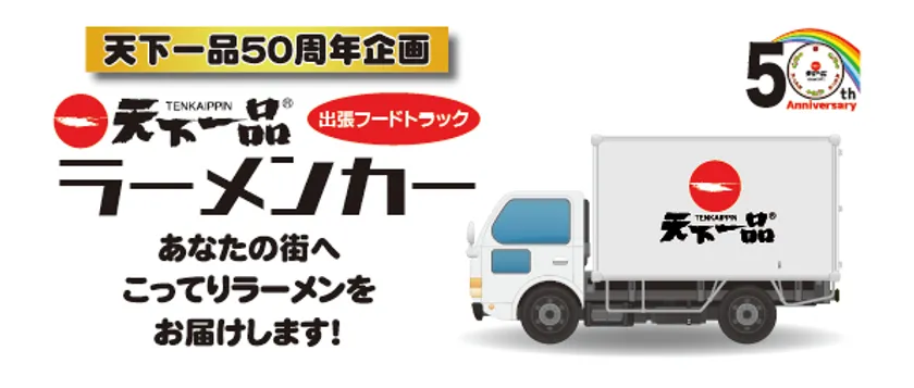 京都北白川発祥、鶏がらや野菜などを用いたこってりスープが人気の中華そば専門チェーン店「天下一品」(本社:滋賀県大津市、グループ累計234店舗を展開中※)は、天下一品50周年企画として、出張フードトラックを利用して1日1組限定で天下一品と一緒に出店を希望される方を2020年11月28日(土)~2021年6月30日(水)まで募集いたします。
