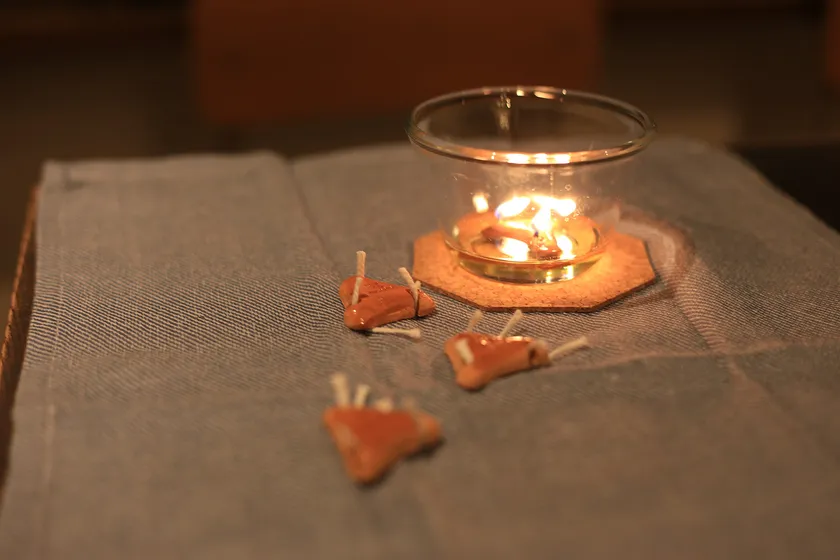 油を吸い込む陶器ですから、糸芯に安定して油を導引します。本体はテラコッタ陶器製で、糸芯を取り替えれば繰り返し使うことができます。