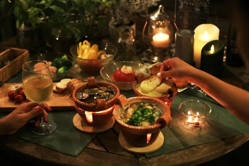 直火OKの器を用いれば、コンロいらずで、卓上やアウトドアで温かいお料理を楽しむことができます。(写真で使用しているアヒージョ鍋・トリベットは、テラコッタ土で成形・特別焼成された、国内生産の陶器です。<コンロ・レンジ使用可> 当社HPにて販売中。)
