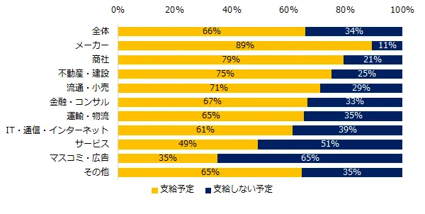 2020年冬季賞与の支給予定を伺うと、66%が「支給予定」と回答しました。全体よりも下回った業界は「マスコミ・広告」(35%) 、「サービス」(49%)、 「IT・通信・インターネット」(61%)でした。