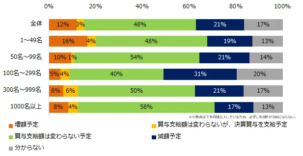 賞与支給予定企業に、昨年と比べて賞与の支給額に変動があるか伺ったところ、48%が「賞与支給額は変わらない予定」と回答。「増額予定」は12%と、昨年より8ポイントマイナス。昨年より増えたのは「減額予定」(21%)。15ポイント増加しました。