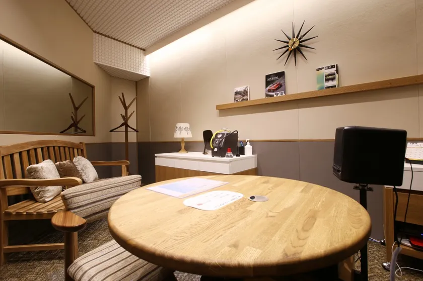 (2) くつろぎのカウンセリング・聴力測定ルーム:リビングやホテルのような心地よいプライベートルームに最新の聞こえの測定ツール等を完備、ご家族など近しい方と一緒に、カウンセリング、聴力測定を受けていただけます。ご家庭に近い環境での試聴体験が特長の珍しい防音室です。(写真は芦屋店。参考イメージ)