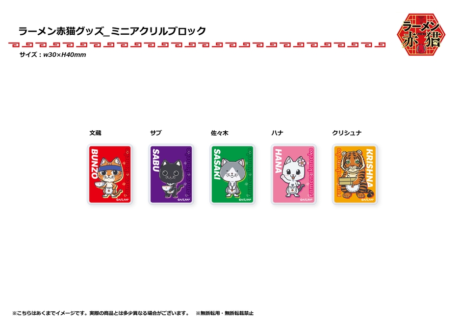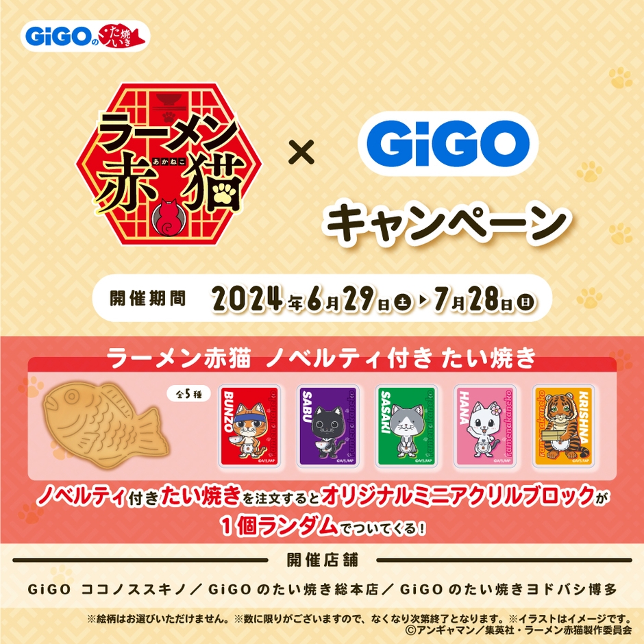 キャンペーン期間中、たい焼き(通常タイプ)を注文すると、『ラーメン赤猫』のノベルティステッカーご購入1匹につき、オリジナルミニアクリルブロック(全5種)がランダムで1個ついてくるノベルティ付きたい焼きを販売いたします。
