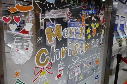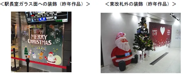 駅長室のガラス面にオリジナルの装飾を施すほか、東改札にはクリスマスツリーやイラストボードも設置します。