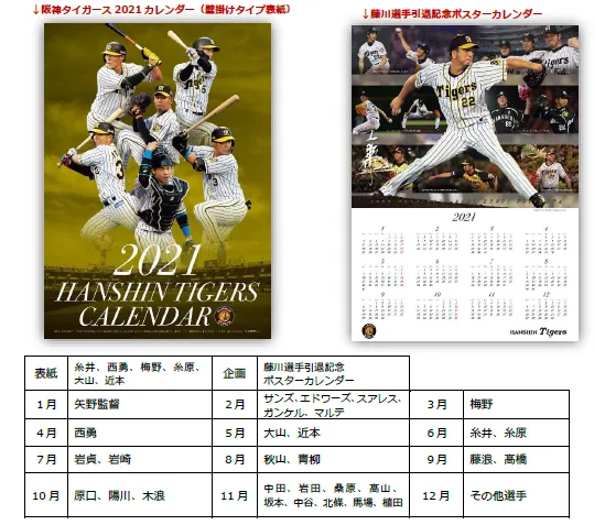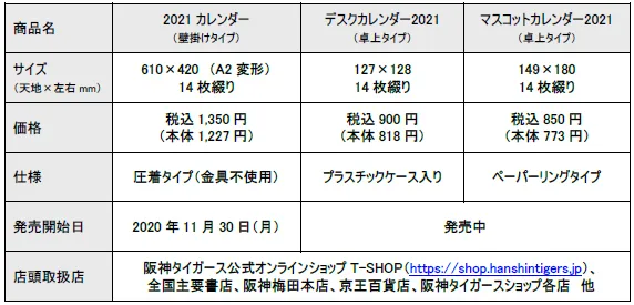 株式会社阪神タイガース及び株式会社阪神コンテンツリンクでは、毎年大勢の阪神タイガースファンの方々からご好評いただいている「阪神タイガース2021カレンダー(壁掛けタイプ)」を、11月30日(月)から、阪神タイガース公式オンラインショップT-SHOP( https://shop.hanshintigers.jp/ )及び阪神タイガースカレンダー事務局( http://hcl-sportsshop.com/ )などで販売します。なお、卓上タイプの「阪神タイガース デスクカレンダー2021」、「阪神タイガース マスコットカレンダー2021」は好評発売中です。