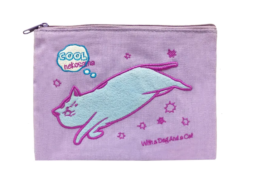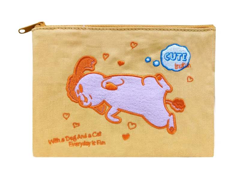 コスメや小物を入れるのに便利なフラットなポーチ。フェルトで刺繍された犬くん、猫さまがポイントです。