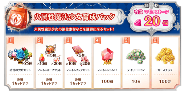 有償マギアストーンで購入できる「火属性魔法少女育成パック(有償)」には以下のアイテムが封入されています。