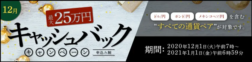 FXプライムbyGMO、 【最大25万円】をキャッシュバック! すべての通貨ペア対象のキャンペーンを12月1日より開始!