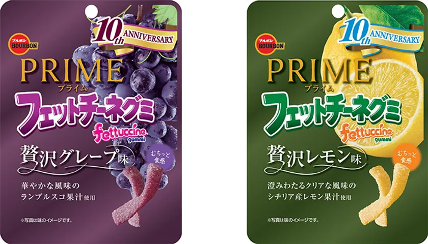 株式会社ブルボン(本社:新潟県柏崎市、代表取締役社長:吉田 康)は、発売から10周年を迎えた“フェットチーネグミ”シリーズに、特別な果汁を使用した「PRIMEフェットチーネグミ贅沢グレープ味」と「PRIMEフェットチーネグミ贅沢レモン味」の2品を2020年12月15日(火)に期間限定で新発売いたします。