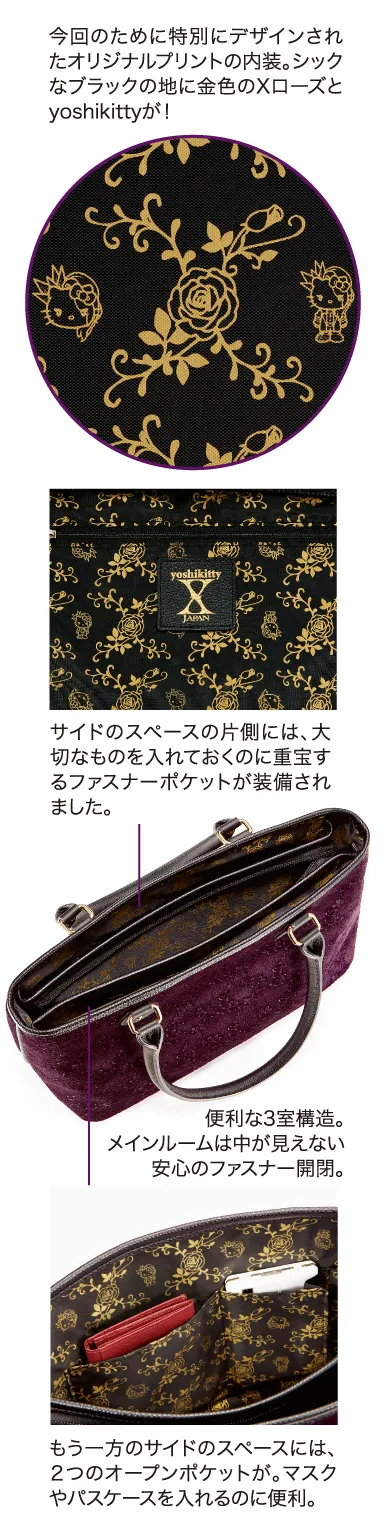 バッグの中はゴールドカラーのyoshikittyとXローズを組み合わせたオリジナルプリントが一面に!お好みでハンドバッグとしてもショルダーバッグとしても使える絶妙な長さのハンドルは上質な牛革製。3室に分かれた使いやすいデザインも魅力で、中央のメインルームは安心のファスナー開閉式です。