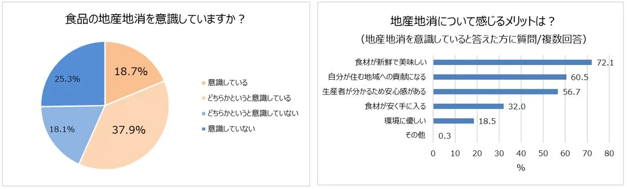 また、地産地消のメリットについて聞いたところ、「食材が新鮮で美味しい」(72.1%)、「自分が住む地域への貢献になる」(60.5%)、「生産者が分かるため安心感がある」(56.7%)などの声が多く挙がりました。これらのメリットに加え、コロナ禍においておうち時間が増加し、自炊する機会や食材を購入する機会が増えたことも、多くの人が地産地消を意識している要因かもしれません。