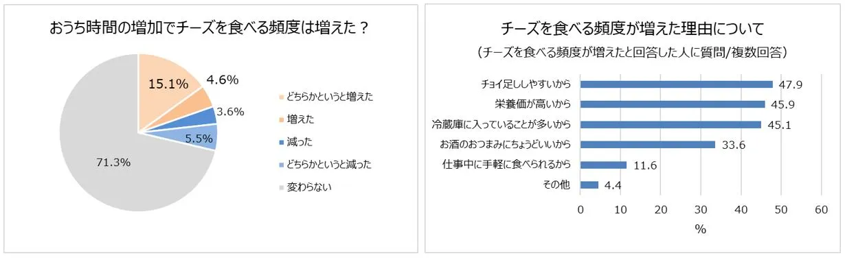ご当地食品に関する調査とあわせて、チーズに関する調査も行いました。家で食事をとる人が増えている中、おうち時間の増加によりチーズを食べる頻度が増えたかについて聞いた結果、「増えた」(4.6%)と「どちらかというと増えた」(15.1%)という回答を合わせて、約2割の人がおうち時間の増加によりチーズを食べる頻度が増えたと回答しました。