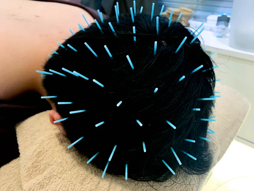 頭部に100本の鍼を用いた施術を行います。
