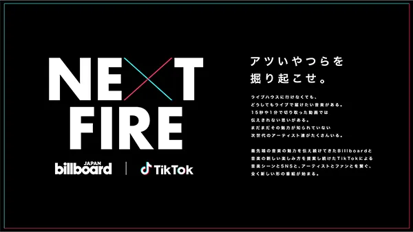 Billboard JAPANとTikTokは『NEXT FIRE』を通じて、次世代アーティストの発掘やライブの新体験を創出し、機能やコーナーの拡充に合わせアーティスト支援に繋がる様々な方法を模索してまいります。