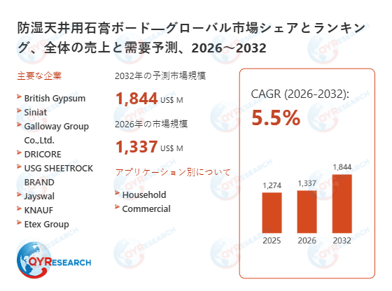 2026年2月11日に、QYResearch株式会社(所在地:東京都中央区)は、「防湿天井用石膏ボード―グローバル市場シェアとランキング、全体の売上と需要予測、2026~2032」の最新調査資料を公開しました。本レポートは、防湿天井用石膏ボード市場の市場規模、成長動向、競争環境、地域別分析、主要企業のランキングを詳細に分析し、市場の全体像を明確にします。特に、主要企業の市場シェアや競争戦略に焦点を当て、売上高、価格動向、需要予測などの詳細データを通じて、業界の現状と将来の展望を示します。2026年から2032年までの市場成長を詳細に予測し、企業の競争力強化と市場戦略の最適化に役立つ実践的な知見を提供しています。また、定量・定性両面の分析を通じて、戦略的な意思決定を強力にサポートし、業界関係者が市場の変化を正確に把握し、持続可能な成長を実現することを可能にします。