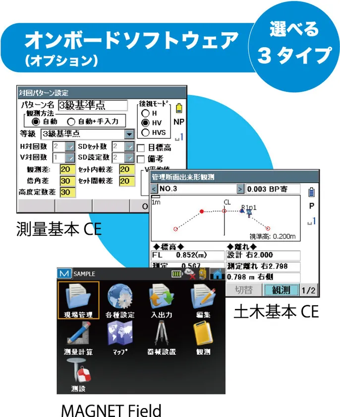 アプリケーションソフトウエアには、測量作業用・土木作業用、そしてその両方を兼ね備えた3タイプを用意し、測量から土木まで現場の多種多様な作業に対応、プロフェッショナルな技術者の方に満足いただけるラインアップを揃えています。