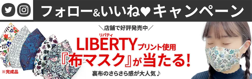 Twitter、Instagramでは、店舗で好評発売中のリバティプリントのマスクが当たるキャンペーンも開催中です。お年賀やクリスマスのプチプレゼントに、マスクはいかがでしょうか。