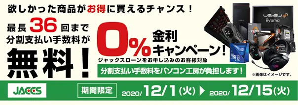 パソコン工房・グッドウィルを運営する株式会社ユニットコム(代表取締役:端田泰三、本社:大阪市浪速区)は、パソコン工房 Web サイトおよび全国のパソコン工房・グッドウィル各店舗にて、ジャックスショッピングローンをご利用の場合、分割支払い金利手数料が最長36 回まで無料になる『ショッピングローン 0%金利キャンペーン』を 2020 年 12 月 1 日(火)より開始しました。