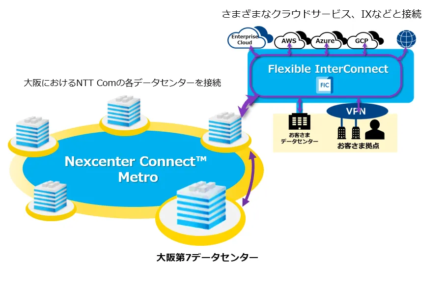 ※1:「Flexible InterConnect」は、お客さま拠点とお客さまが利用されているさまざまなクラウドサービスやデータセンターなどの間をセキュアにつなぎ、接続先や帯域、セキュリティ設定などのICT環境を一元管理することができる次世代インターコネクトサービスです。大阪第7データセンターでは、「Nexcenter Connect Metro」経由で利用いただけます。