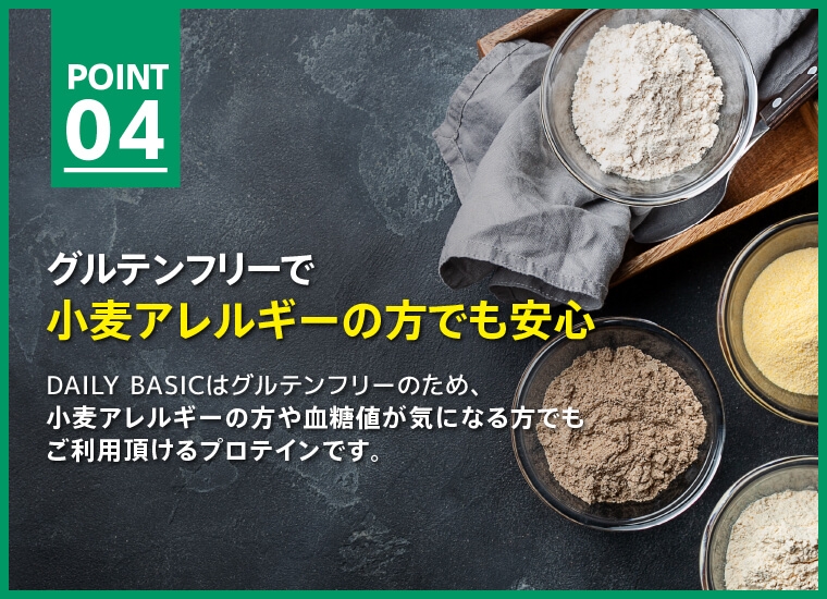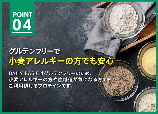 DAILY BASICではグルテンフ リーを採用。小麦アレルギーの方や血糖値 が気になる方でも安心してご 利用頂けるプロテインです。