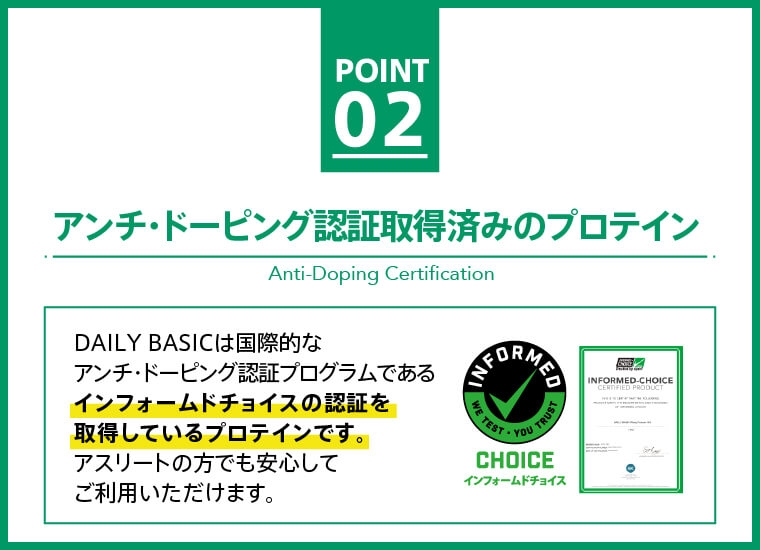 DAILY BASICは国際的なアン チ・ドーピング※4認証プログラム であるインフォームドチョイスの 認証を獲得。アスリートの方でも安心してご利 用いただけます。