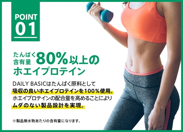 DAILY BASICはたんぱく原料と して、吸収の良いホエイプロテイ ンを100%使用。ホエイプロテインの配合量を高 めることにより、無駄の無い商品 設計を実現しました。