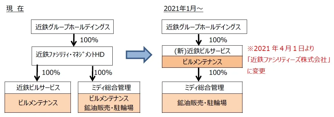 近鉄ビルサービス株式会社は事業規模の拡大と生産性向上を目的として、2021年1月1日にグループ会社のミディ総合管理株式会社と統合し、同年4月1日に社名を「近鉄ファシリティーズ株式会社」に変更することを決定いたしましたのでお知らせいたします。ビルメンテナンスにとどまらず、ファシリティ業務全般を取り扱うことで、ファシリティのオーナー様だけでなく、ご利用のお客様にも快適さをお届けできるような会社を目指したいという思いから、「ファシリティーズ」という社名にいたしました。