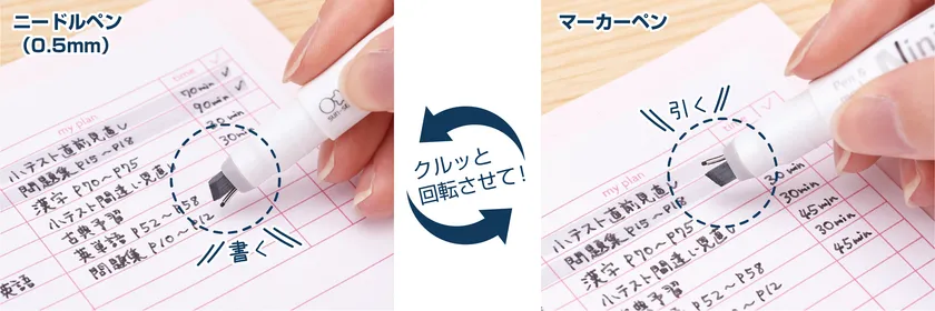 「ペンで書く」と「マーカーで引く」機能を1つのペン先に集約させることで、持ち替える煩わしさを解消した新機能ペン。ペン先は、細かい文字が書きやすいニードルペン(0.5mm)と大事なところを目立たせることができるマーカーペンの2種類が一体化し、手に持ちながらクルッと回転させるだけで、簡単に使い分けることができます。