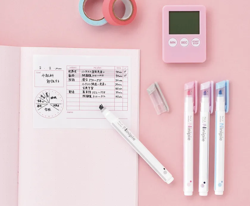 ライトピンク×ピンク、ライトイエロー×イエロー、ライトブルー×ブルー、グレー×ブラック、ライトグリーン×ピーチピンク、ライトバイオレット×ネイビーの選べる6色展開。ニードルペンとマーカーペンでインクが異なるので、マーカーを引いた上からペンで文字を書き込む際にも見やすい仕様です。
