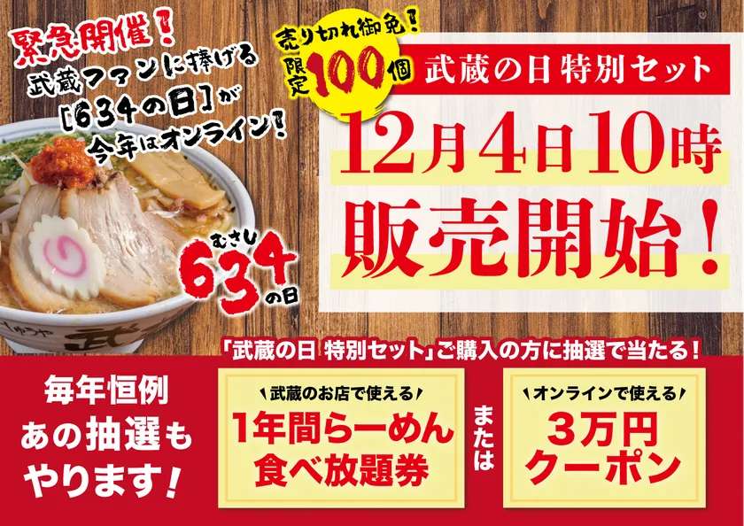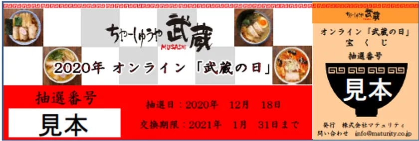 株式会社マテュリティ(本社:長野県上田市、代表取締役:翠川 忠彦)が運営するラーメン店「ちゃーしゅうや武蔵」は、2020年12月4日から(商品なくなり次第終了)、オンライン「武蔵の日」として当社オンラインショップにてこの日のために数量限定でご用意した「武蔵の日特別セット」を発売いたします。またこの特別セットには宝くじが同梱されており、抽選で10名様に年間パスポートorオンラインショッピングで使えるクーポンコード(3万円相当)をプレゼントするキャンペーンを同時開催いたします。