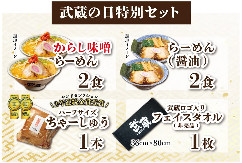 ラーメン大国新潟県発祥の「からし味噌ラーメン」を中心に全国31店舗を展開する「ちゃーしゅうや武蔵」が毎年6月に開催しているイベントです。熱狂的なファンも多く、スピードくじや期間限定価格でメニューが提供される等、全店で例年約2万人以上が来店されるほどの名物イベントです。しかしながら今年6月の開催は、新型コロナウイルスの流行もあり、密を避けるために苦渋の決断ではございますが見送りとなっておりました。そのような中ではございますが、こんな時期だからこそ、ファンの皆様に2020年も武蔵の日を味わって年を越していただくことは出来ないかスタッフ皆で考え、オンライン上で開催する運びとなりました。例年実施しているイベント内容とは少し異なりますがオンラインならではの商品で楽しんでいただければと思います。