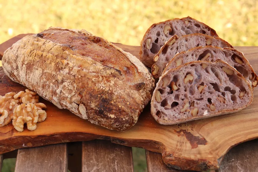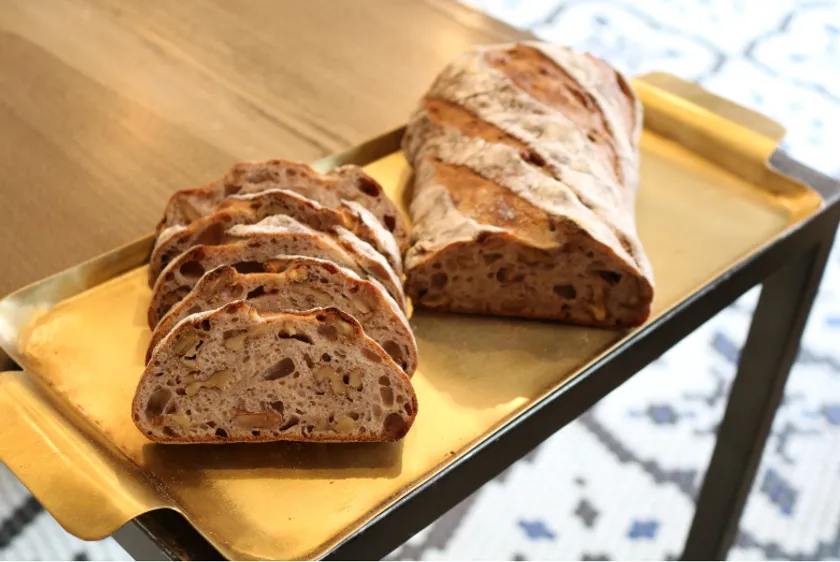 サワー種を使用した生地にカリフォルニア産のくるみをたっぷりと加え、石窯の豊富な熱で包み込むように焼きあげました。かみしめるほどに生地の旨みとくるみの香ばしさが広がります。