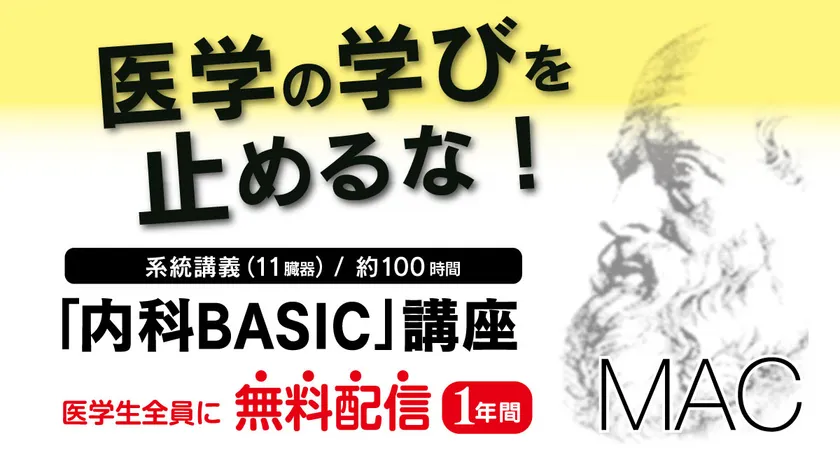 幅広い世代の医学教育を手掛ける、株式会社マック・メディカル・アカデミー・コーポレーション(本社:東京、代表取締役:瀬戸 宗博、以下 MAC)( http://www.macmic.net/ )は、新型コロナウイルスの長期的な影響が今後も続く中で医学の学びを止めてはいけないと、MAC iSchool アイスクールにおいて、内科学の系統講義である『内科BASIC』講座を2022年の2月中旬まで約1年間無料で公開することにいたしました。MACは、医師となって臨床現場へ羽ばたく医学生の皆様を全力で応援します。