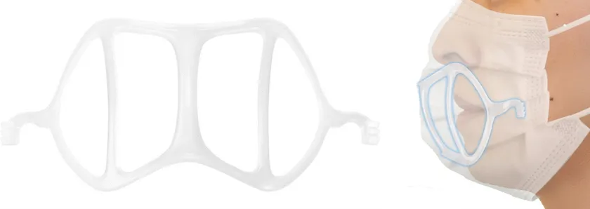 「立体インナーマスク 快適フレーム」を取り付けることでマスクの内側に立体空間が生まれ、息苦しさ、声のこもり、話しづらさ、ムレ、口紅移り等、様々な不快感を解消することができます。